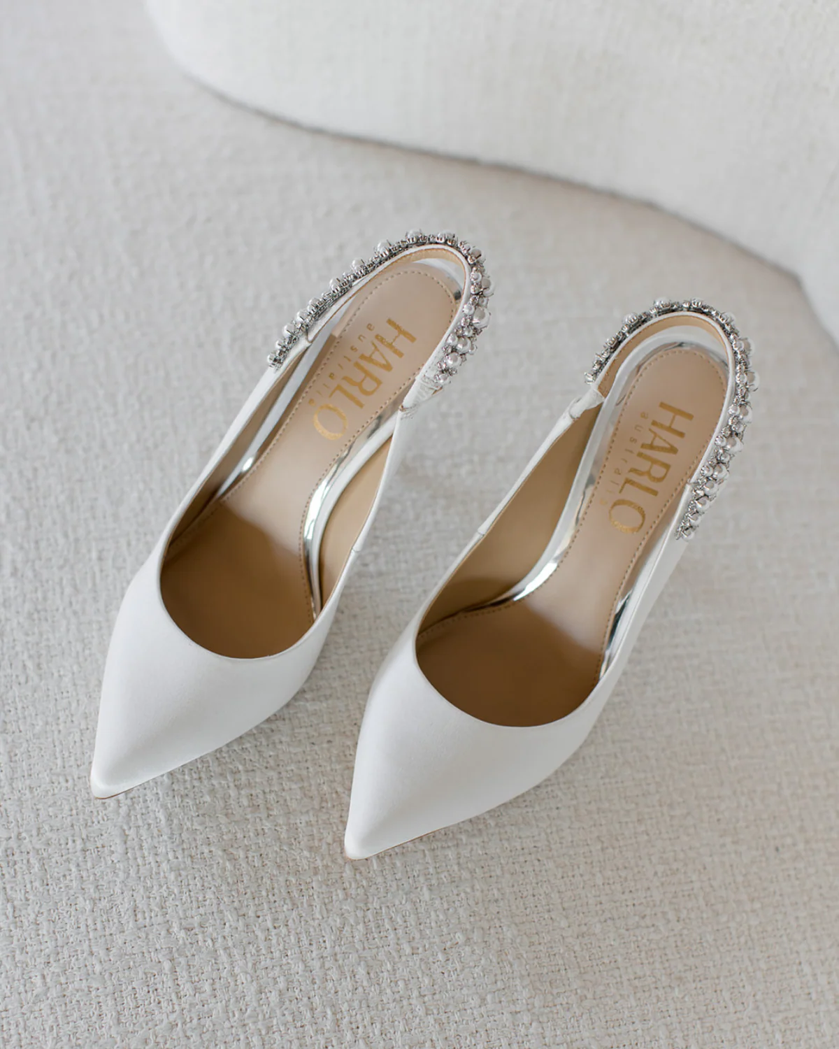 Bonnie Pearl by HARLO Australia features a stunning array of white pearls surrounded by sparkling crystals encrusted along the delicate slingback ankle strap. The pointed toe and slim stiletto high heel have a luxurious satin finish creating a timeless and feminine style. The classic front and extravagant back embody a sophisticated look that is sure to turn heads. The soles are leather lined and double padded to maximise comfort. The Bonnie Pearl is perfect for your next evening look or bridal attire, complimenting those who are after effortless elegance.