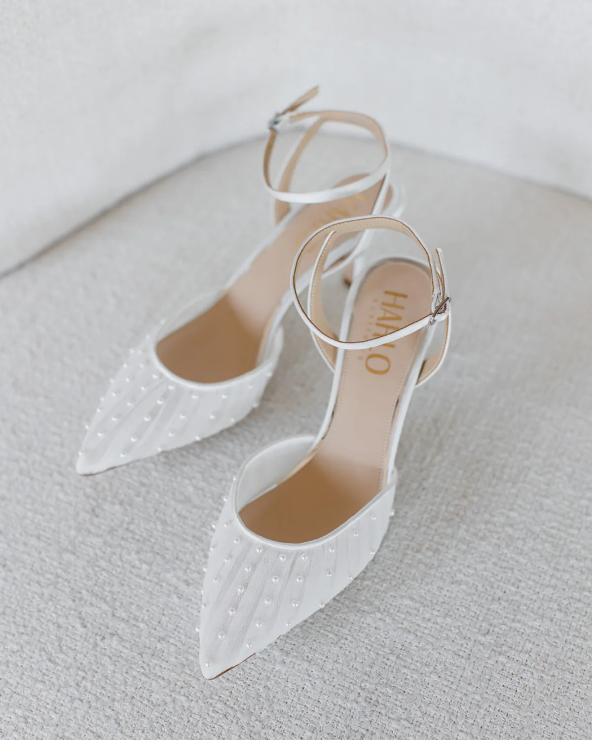Ellie by HARLO Australia is a kitten heel version of the best selling Chantelle Pearl Heel. Ellie features a beautiful finish of both satin and tulle, making it an ideal choice for a tulle or satin based gown. The pointed toe has delicate tulle pleats, lovely hand-sewn pearls and a satin cap, creating a truly soft and romantic look. The classic point and open heel ankle strap design shape an elegant and timeless silhouette, while the slim stiletto high heel adds height and a touch of sophistication. The soles are leather lined and double padded to ensure the Ellie Heel is the perfect for your perfect day.